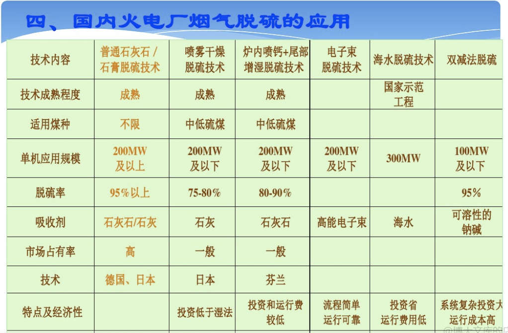 火电厂脱硫技术主要有煤炭洗选、CFBC洁净煤燃烧技术流化床锅炉、FGD烟气排放脱硫等。