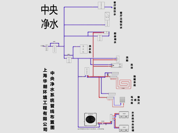全屋中央净水是系统型配置,水量大,能负责整个室内的直饮喝水、洗菜洗碗、洗澡、泡澡、洗脸、刷牙、洗衣、浇花、地暖循环水、水系统空调循环水、毛巾架热水、明装散热片循环水等等。系统功能包括净水和软水。直饮喝水和厨房洗菜洗碗用净水,其它用软水。全屋净水系统配置了智能反冲洗前置过滤+中央净水机+中央软水机+超滤净水器+反渗透膜净水器末端直饮机等,水量大、功能全、效果好。中央净水系统通过多重全效组合过滤,实现水质的纯净和消毒,最终达到使用标准和饮用标准。中央净水系统,目前正成为每个新装修家庭的必备净水系统。