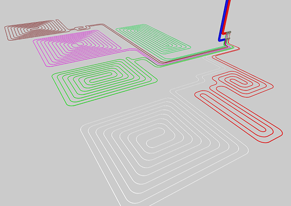 通过燃气壁挂炉或空气源热泵主机提供热源,将热水由分水器送达各房间或分区的地面热水盘管,热量从地面散热到房间,整个家居空间温暖舒适,热水回水经由地面盘管回到集水器再到热源主机,反复循环。整个系统各房间或分区均可以单独设定控制温度,确保完全符合人体舒适度。